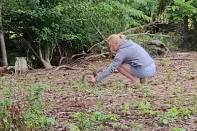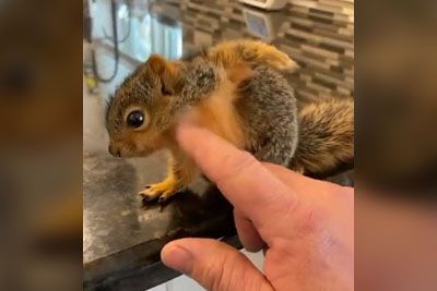 Wife Walks In The Wood, A Cute Squirrel Climbs On Her Arm