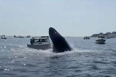 Breaching Whale Jumps Out Of Ocean And Lands On Top Of A Fishing Boat
