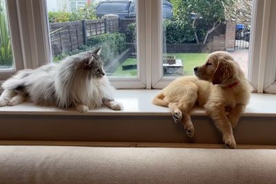 Owner Introduces His Cat To A New Golden Retriever Puppy