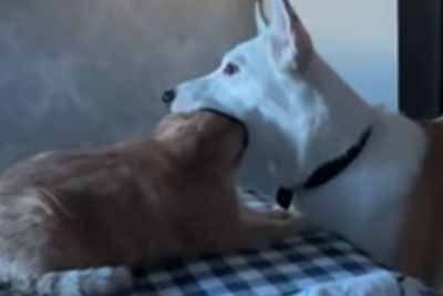 Dog Fits Head Of Pet Cat In Her Mouth Leaving Him Baffled