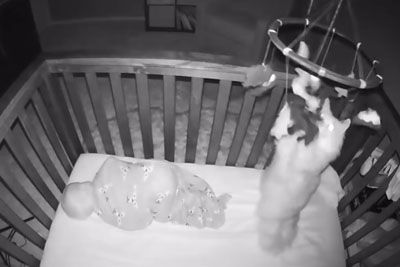 Cat Climbs Into Baby Crib, Enjoys A Nap And Plays Next To Baby