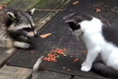 Cat Swats Hands Of Raccoon Trying To Steal Food From Under Deck While They Eat