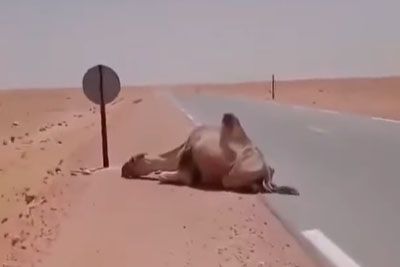 Truck Driver Helping Thirsty Camel On The Road