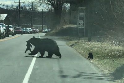 Mama Bear Struggles To Take Their Bear Cubs Across The Road