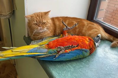 Parrot Lies Down Next To Her Animal Friend Cat