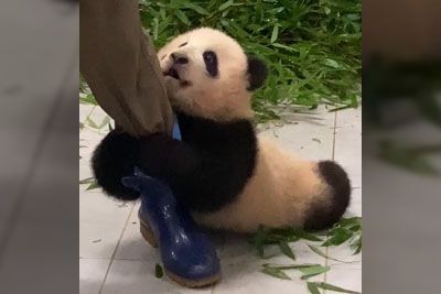 Baby Panda Glued To The Zookeeper Dragging Her Around