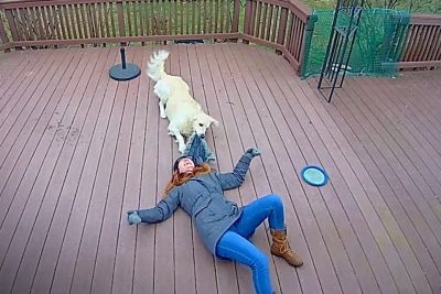 Dog Mistakes Furry Hood For A Toy, Drags Owner Around The Backyard