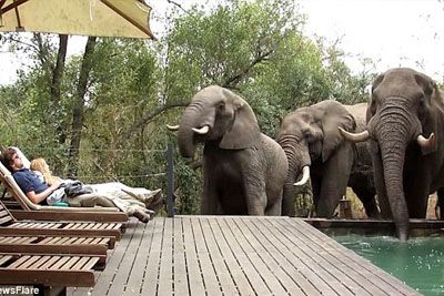 Couple's Afternoon By The Pool Is Interrupted By Three Thirsty Elephants