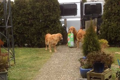 Golden Retrievers Happily Helping Owners Bring In Groceries From The Car