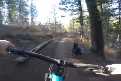 A Mountain Biker Races His Very Happy Pup Down A Trail, Struggles To Keep Up