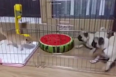 Two Puppies Have Best Reaction On Kitten In The Same Cage