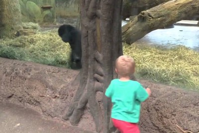 Toddler Runs To Look At Young Gorilla. No One Expects The Two Of Them To Play Peek-A-Boo