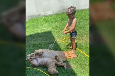 Kid Hoses Off Golden Retriever Puppies On Hot Day