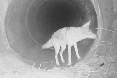 Coyote Waits For A Badger To Enter A Drain Pipe Together