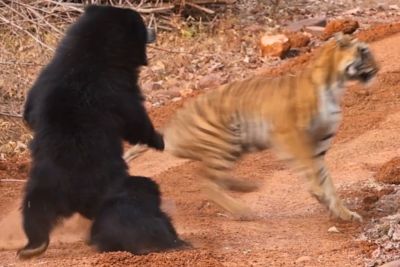 Sloth Bear Mum Stands On Back Legs To Scare Tiger