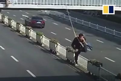 Bus Catches Worker Dangling From Bridge In China