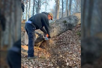 Guys Cut Fallen Tree, Then Water Starts Flowing Out