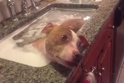 Abused Dog Takes Bubble Bath In Kitchen Sink, Becomes Internet Sensation